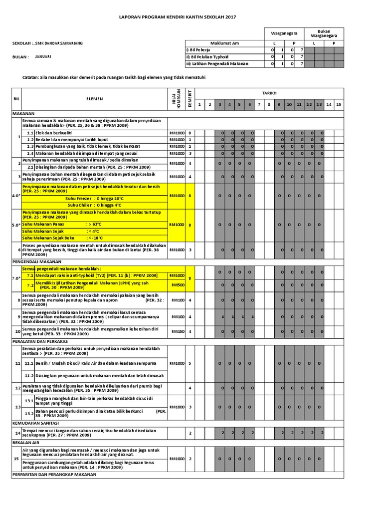 Hem Borang Panduan Sktatau Weebly Com from sktatau.weebly.com Borang senarai semak pemantauan kantin sekolah. Mukasurat 2 daripada 2 borang penilaian bulanan kebersihan kantin / dapur asrama warga bukan warga negara negara premis Dapatkan dari majalah, surat khabar, klinik kesihatan, hospital dan sebagainya isi borang pemantauan pemantauan berdasarkan garis panduan laporan kendiri kantin. Sehubungan dengan akan dilaksanakannya monitoring dan evaluasi kelembagaan dan sistem informasi diberitahukan kepada perguruan tinggi swasta untuk mendownload borang monev 2018 terlampir dibawah ini. Penilaian kendiri kantin terdiri dari 3 iaitu: Januari 2013 bulan bil makanan ramuan dan makanan mentah berkualiti, label mematuhi peraturan, pembungkusan sempurna dan disimpan. Sentiasa berdisiplin, bersopan santun dan mengamalkan budi pekerti yang baik semasa di kantin. Muat turun senarai kehadiran ahli mesyuarat agung pekdis kali ke 10 2018.